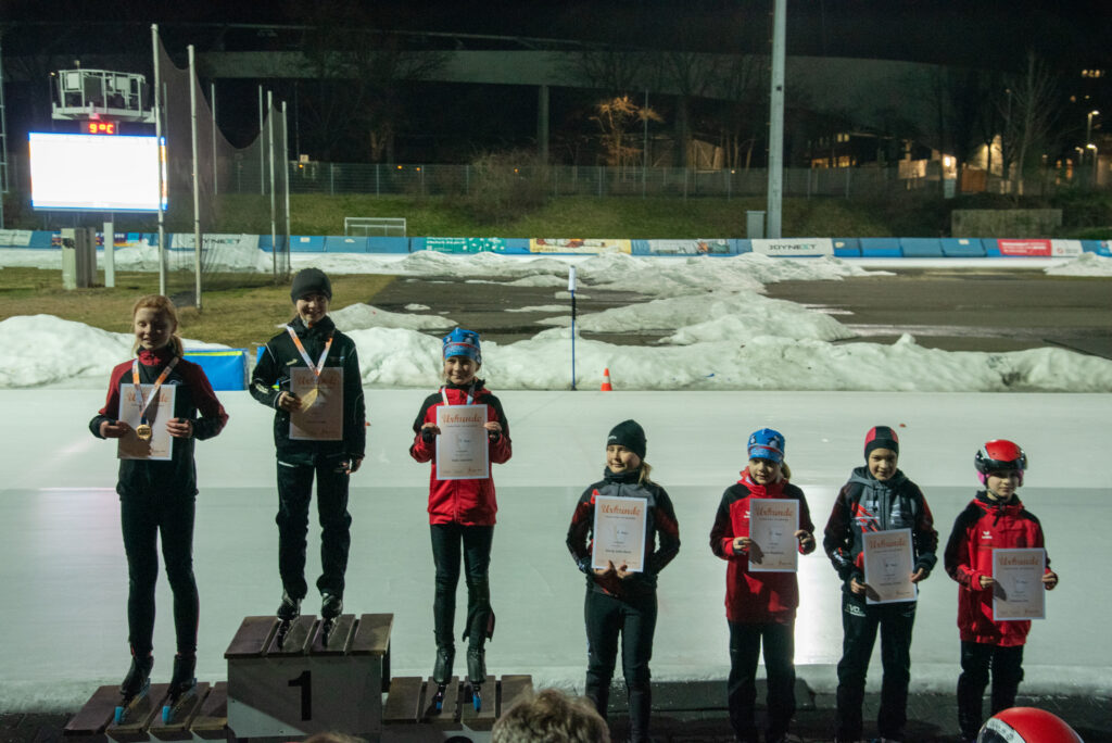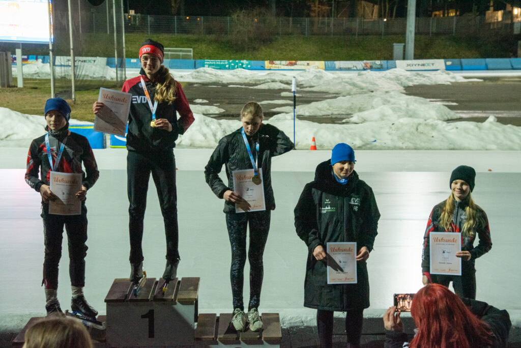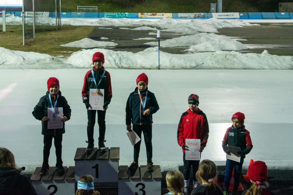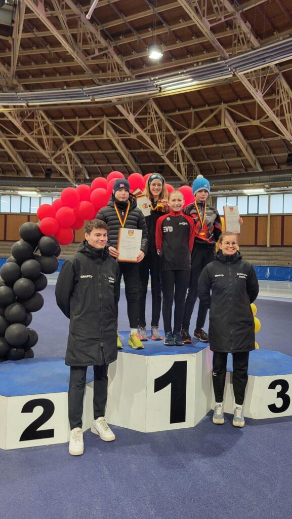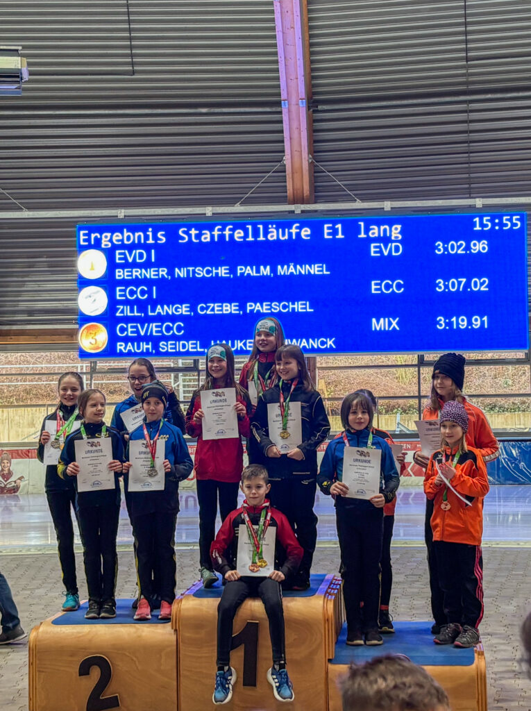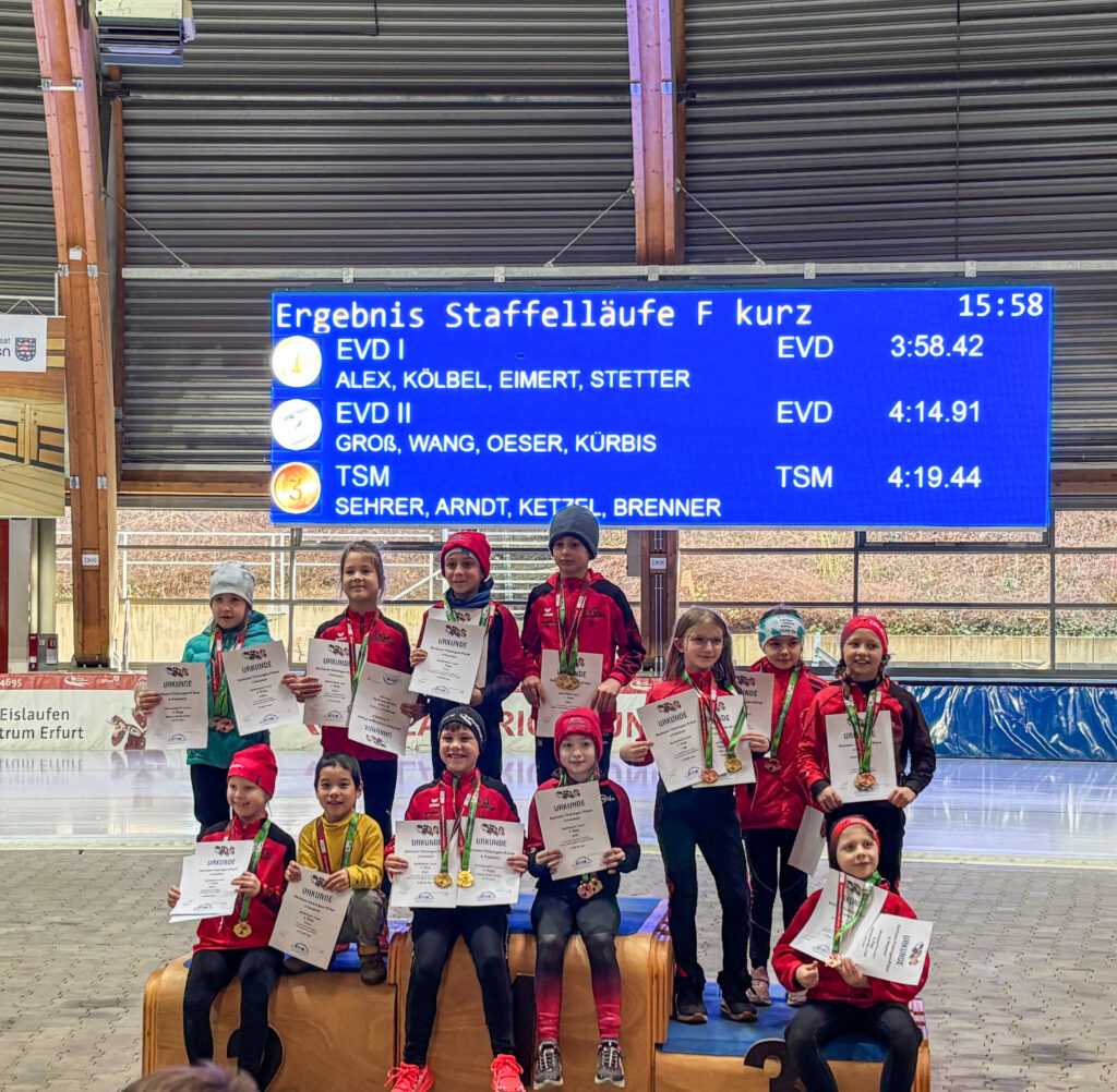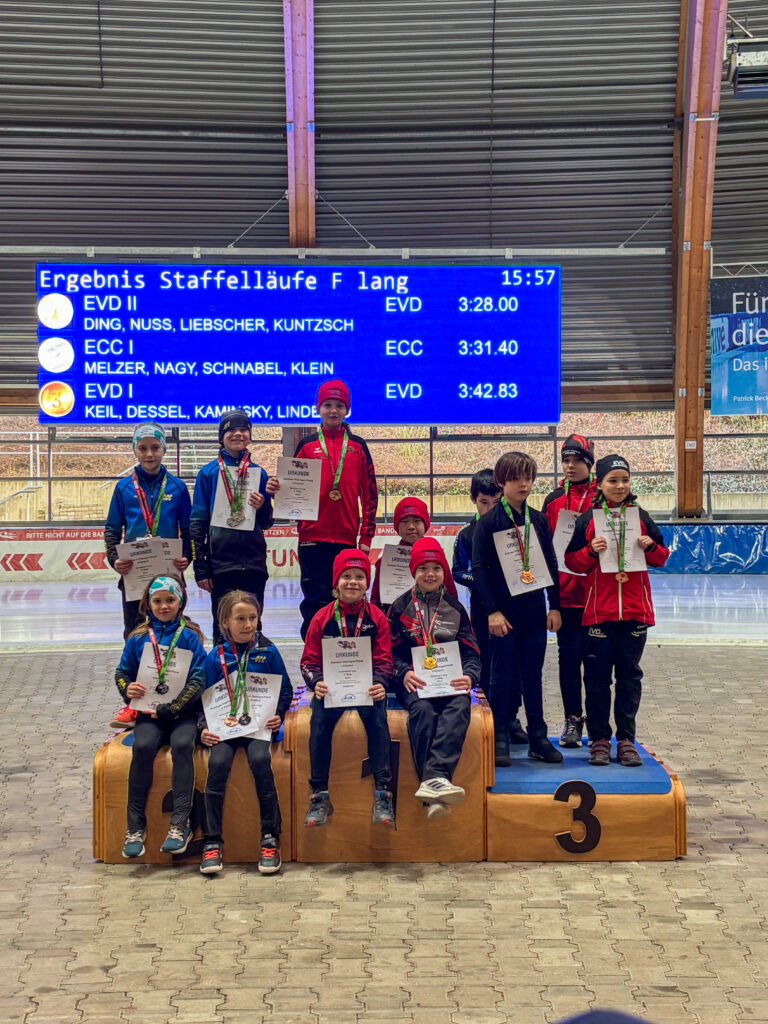 Ein Höhepunkt zum Abschluss des Wettkampftages war der überragende Staffellauf. Hier kam diesmal niemand am EVD e. V. vorbei. Egal ob lange oder kurze Kufe, ob AK F1, F2 oder E1. Alle Staffeln konnten wir für uns entscheiden. In der Startkategorie F lang ergatterte die EVD1-Staffel mit Kai Ding, Stephanie Nuss, Magdalena Liebscher und Aaron Kuntzsch den 1. Platz. Die Staffel mit Luke Keil, Leonard S. Dessel, Julia Kaminsky und Daniel Lindenau hat es trotz müder Beine auf den 3. Platz geschafft. In der Kategorie F kurz erlief der EVD mit Lenny Alex, Ben T. Kölbel, Marisol J. Eimert und Leopold Stetter ebenfalls den Sieg. Die zweite Staffel des EVD (Helena Groß, Muzhi Wang, Theresa Kürbis, Felia Leser) in dieser Startklasse sicherte sich grandios gleich noch Platz 2. Die Staffel EVD 1 der AK E1 (mit Frieda Berner, Jonas Nitsche, Charlotte Palm und Ella Männel) krönte ihre tolle Mannschaftsleistung ebenfalls mit der Goldmedaille.