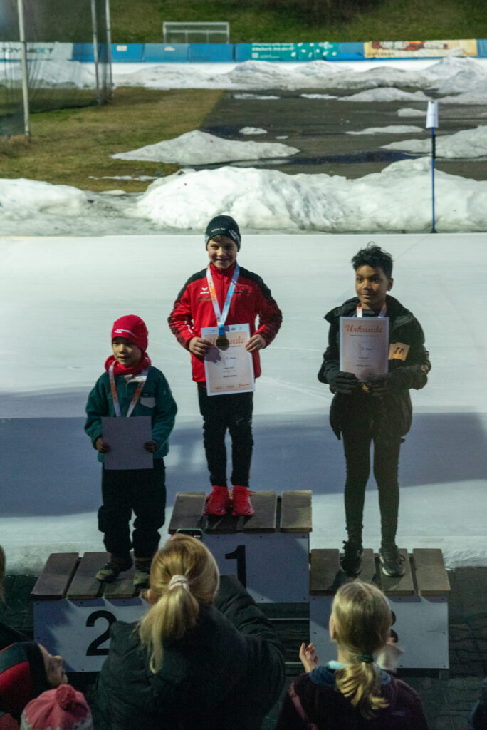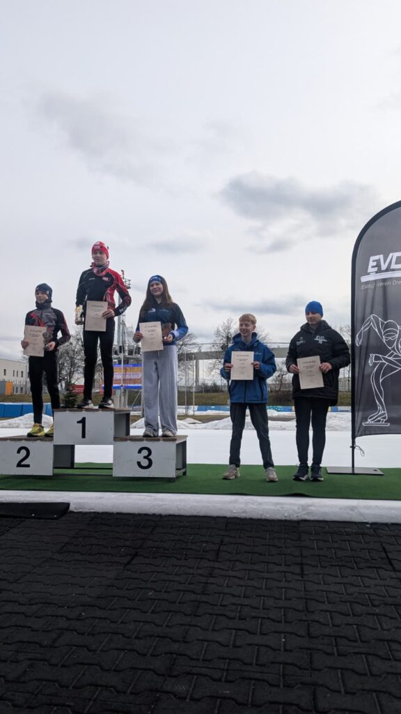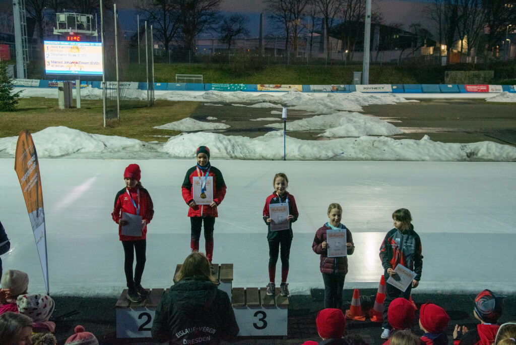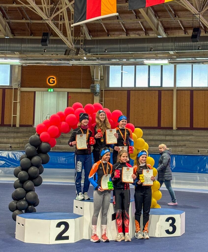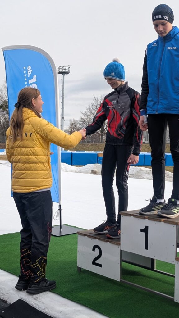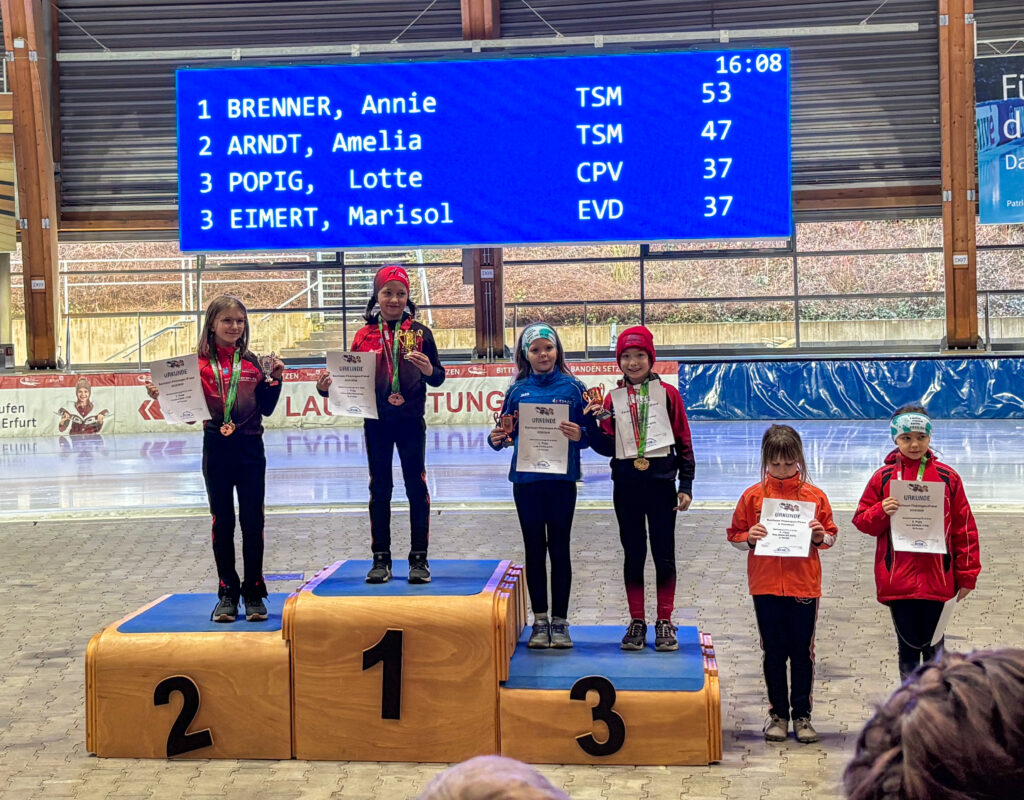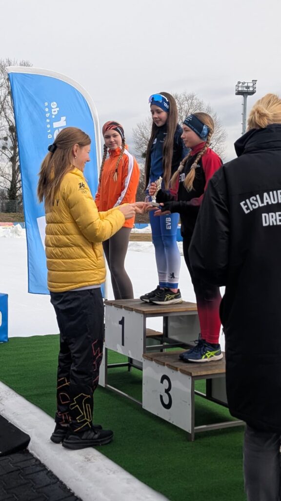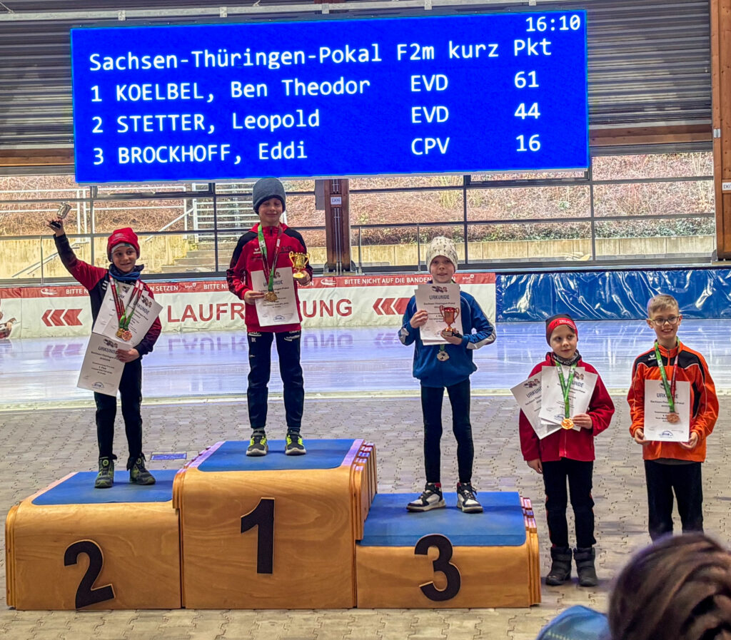 Ein Höhepunkt zum Abschluss des Wettkampftages war der überragende Staffellauf. Hier kam diesmal niemand am EVD e. V. vorbei. Egal ob lange oder kurze Kufe, ob AK F1, F2 oder E1. Alle Staffeln konnten wir für uns entscheiden. In der Startkategorie F lang ergatterte die EVD1-Staffel mit Kai Ding, Stephanie Nuss, Magdalena Liebscher und Aaron Kuntzsch den 1. Platz. Die Staffel mit Luke Keil, Leonard S. Dessel, Julia Kaminsky und Daniel Lindenau hat es trotz müder Beine auf den 3. Platz geschafft. In der Kategorie F kurz erlief der EVD mit Lenny Alex, Ben T. Kölbel, Marisol J. Eimert und Leopold Stetter ebenfalls den Sieg. Die zweite Staffel des EVD (Helena Groß, Muzhi Wang, Theresa Kürbis, Felia Leser) in dieser Startklasse sicherte sich grandios gleich noch Platz 2. Die Staffel EVD 1 der AK E1 (mit Frieda Berner, Jonas Nitsche, Charlotte Palm und Ella Männel) krönte ihre tolle Mannschaftsleistung ebenfalls mit der Goldmedaille.