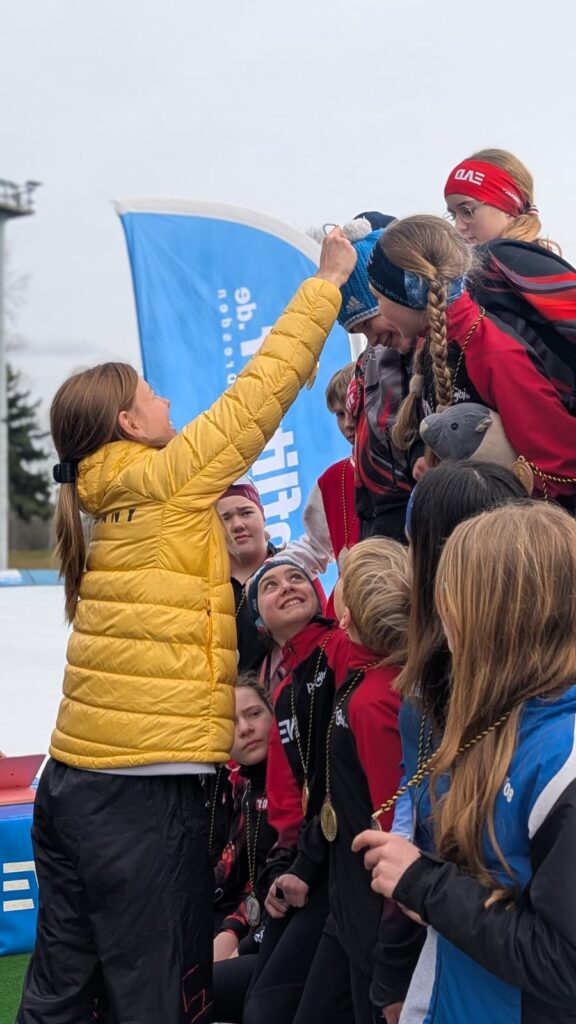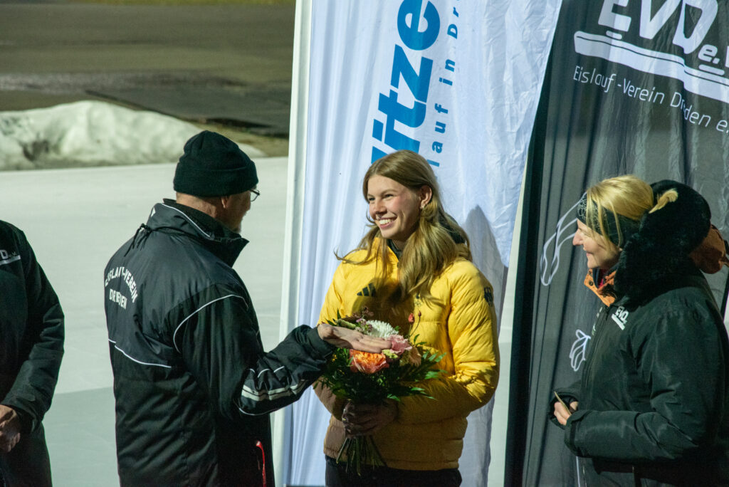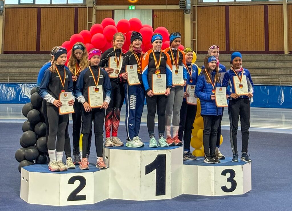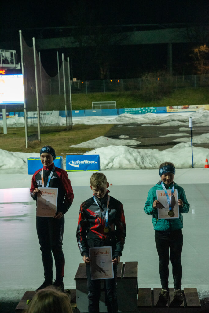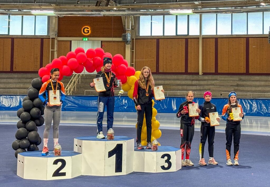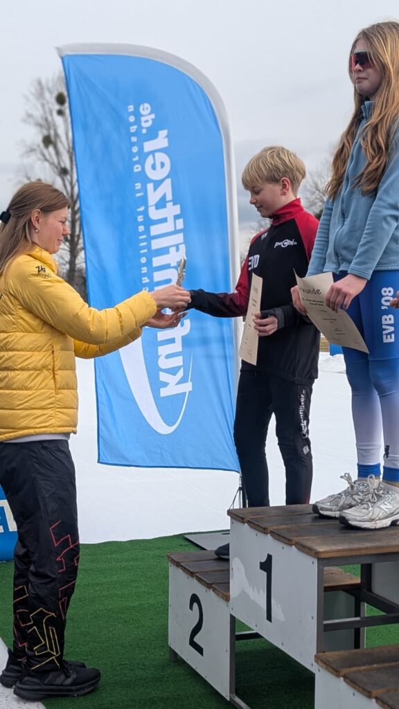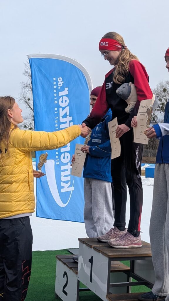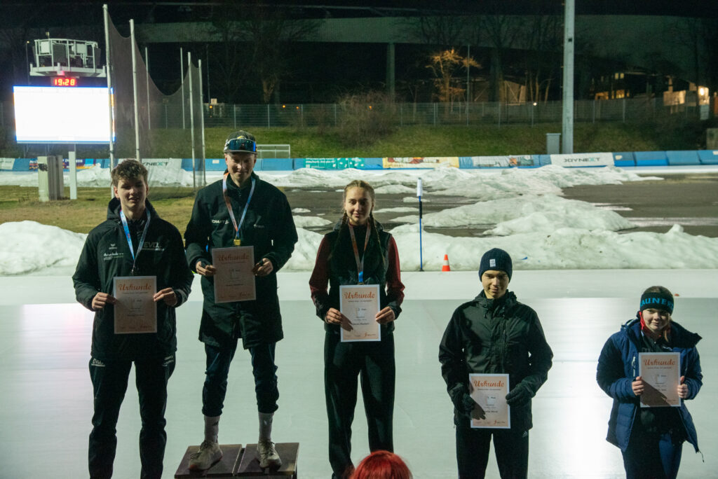 Ein Höhepunkt zum Abschluss des Wettkampftages war der überragende Staffellauf. Hier kam diesmal niemand am EVD e. V. vorbei. Egal ob lange oder kurze Kufe, ob AK F1, F2 oder E1. Alle Staffeln konnten wir für uns entscheiden. In der Startkategorie F lang ergatterte die EVD1-Staffel mit Kai Ding, Stephanie Nuss, Magdalena Liebscher und Aaron Kuntzsch den 1. Platz. Die Staffel mit Luke Keil, Leonard S. Dessel, Julia Kaminsky und Daniel Lindenau hat es trotz müder Beine auf den 3. Platz geschafft. In der Kategorie F kurz erlief der EVD mit Lenny Alex, Ben T. Kölbel, Marisol J. Eimert und Leopold Stetter ebenfalls den Sieg. Die zweite Staffel des EVD (Helena Groß, Muzhi Wang, Theresa Kürbis, Felia Leser) in dieser Startklasse sicherte sich grandios gleich noch Platz 2. Die Staffel EVD 1 der AK E1 (mit Frieda Berner, Jonas Nitsche, Charlotte Palm und Ella Männel) krönte ihre tolle Mannschaftsleistung ebenfalls mit der Goldmedaille.