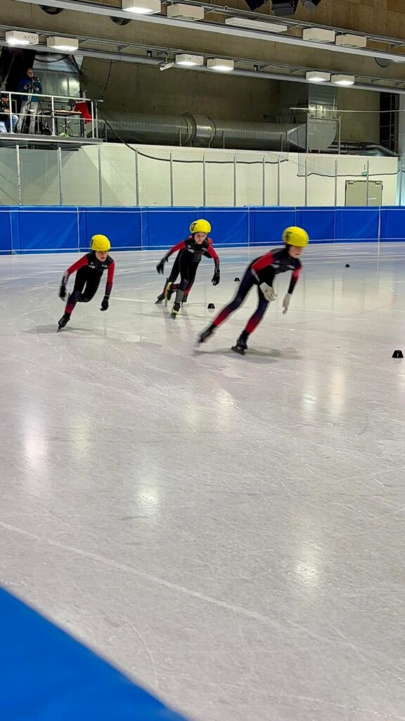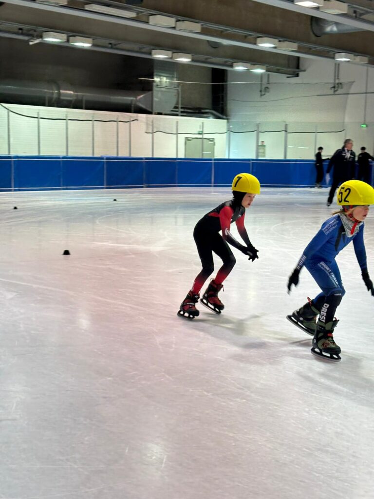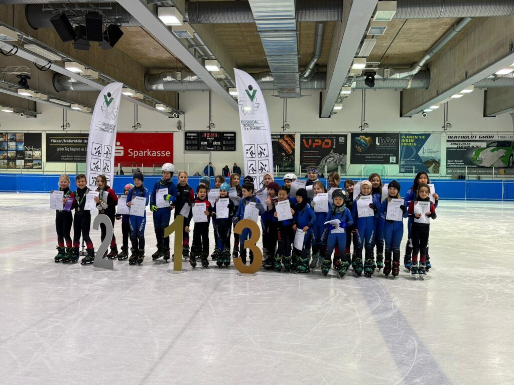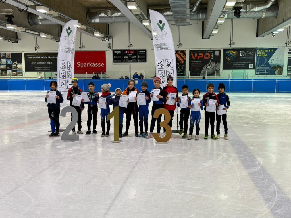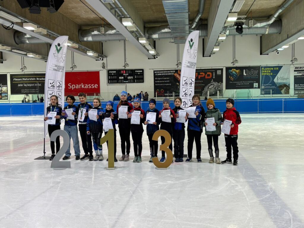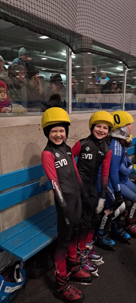 Was für ein Tag! Unsere kleinen Sportler hatten bereits Ende März die Chance, sich bei den Sächsischen Meisterschaften auf der 111 m Bahn mit echten Shorttrackern zu messen – und das hatte es in sich!