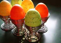 „Und ob ich dir helfe“, rief Georg Oster, „erst bemalen wir die Eier und dann legen wir sie dem Grummelbären irgendwohin, sodann er sie finden muss!“ Gesagt, getan. Eier, Pinsel, Farbe waren schnell besorgt und emsig bemalten sie die Eier strahlend bunt – ganz wie Marthas Augen. Sie versteckten noch im Morgengrauen die kleinen Kostbarkeiten, überall legten sie bunte Eier hin – da vernahm sie auch schon die polternden Schritte des Eisbärvaters. Als der nun das erste Ei sah, staunte er: „Das gibt“s doch nicht! Bunte Eier! Auf dem Nordpol?“