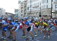 Tilo und Stefan Rumpus (Experts Race Team) kurz nach dem Start am KranzlereckDicht gedrängt standen die Zuschauermassen in mehreren Reihen an den Absperrzäunen direkt vor der Gedächtniskirche um den Start und die Zieleinkunft der Skater direkt miterleben zu können. Bei keinem Skaterennen ist die Stimmung an der Strecke so euphorisch wie in den lauen Sommernächten in Berlin.