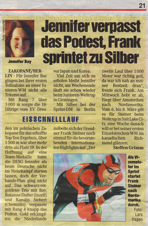 Das erfolgreiche Abschneiden unserer Youngsters Jennifer Bay (bei der JWM in Zakopane) und Frank Steiner (bei der Sprint-DM in Berlin) ist auch der Presse nicht verborgen geblieben. Am 24. Februar berichtete die Dresdner Morgenpost über unsere Kufenflitzer.
