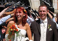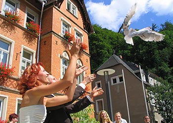 Mit Tauben und Schlittschuh-Spalier geht es nun ins „Abenteuer“ Ehe.